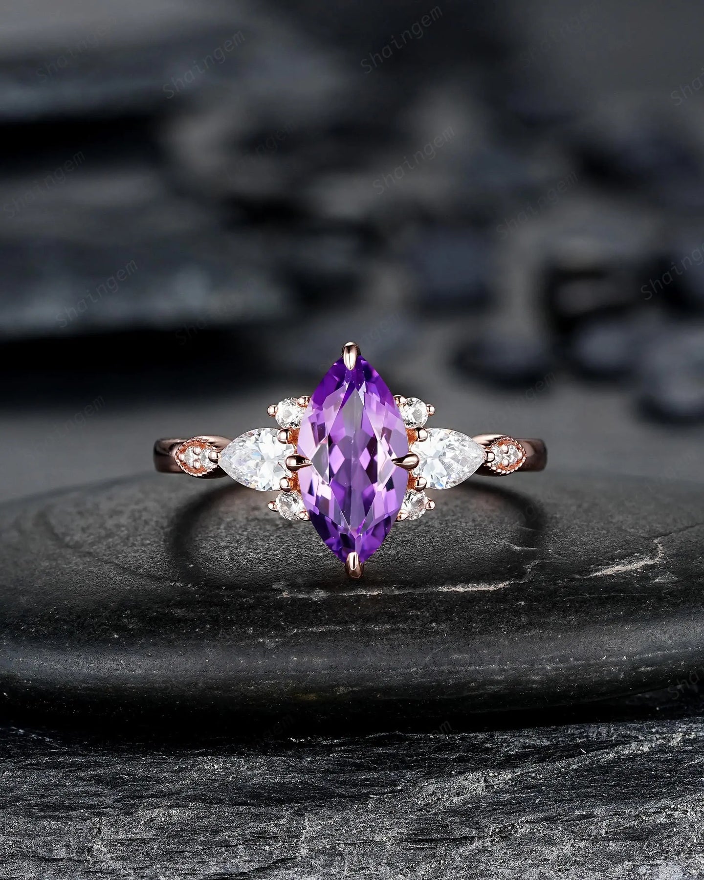 Marquise Cut Purple Amethyst Engagement Ring, Rose Gold Cluster Wedding, Silver 925 Promise 24K Gold Plated, Platinum February Birthstone