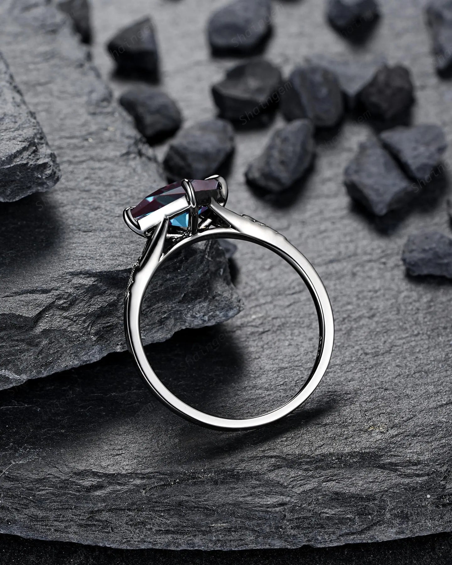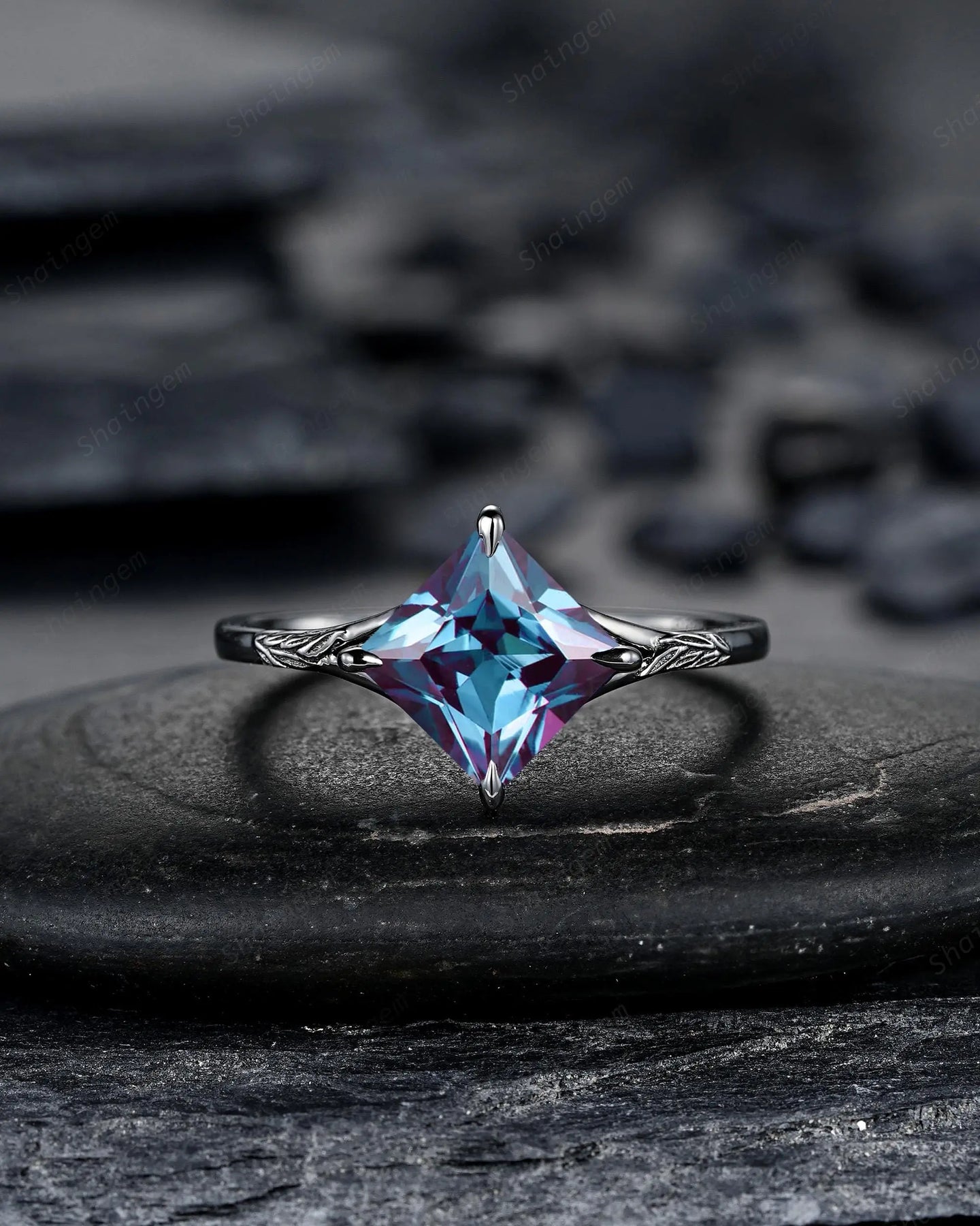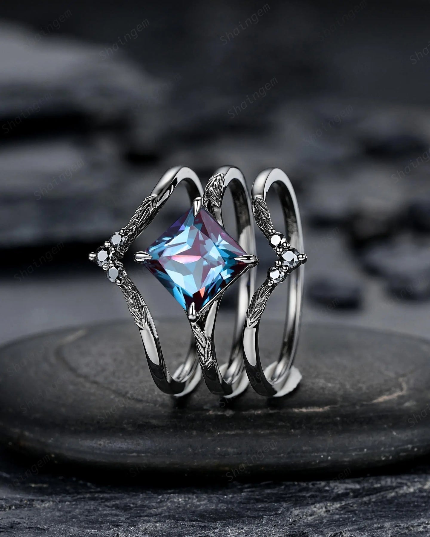 3PCS Gothic Princess Cut Alexandrite Engagement Ring Set, Punk Goth Black Rhodium Wedding Set Promise Ring, June Birthstone, Engraved Leaf