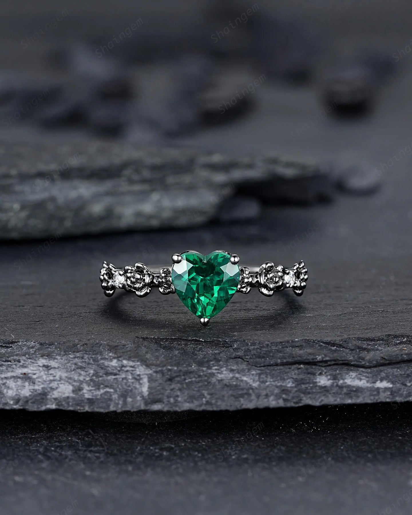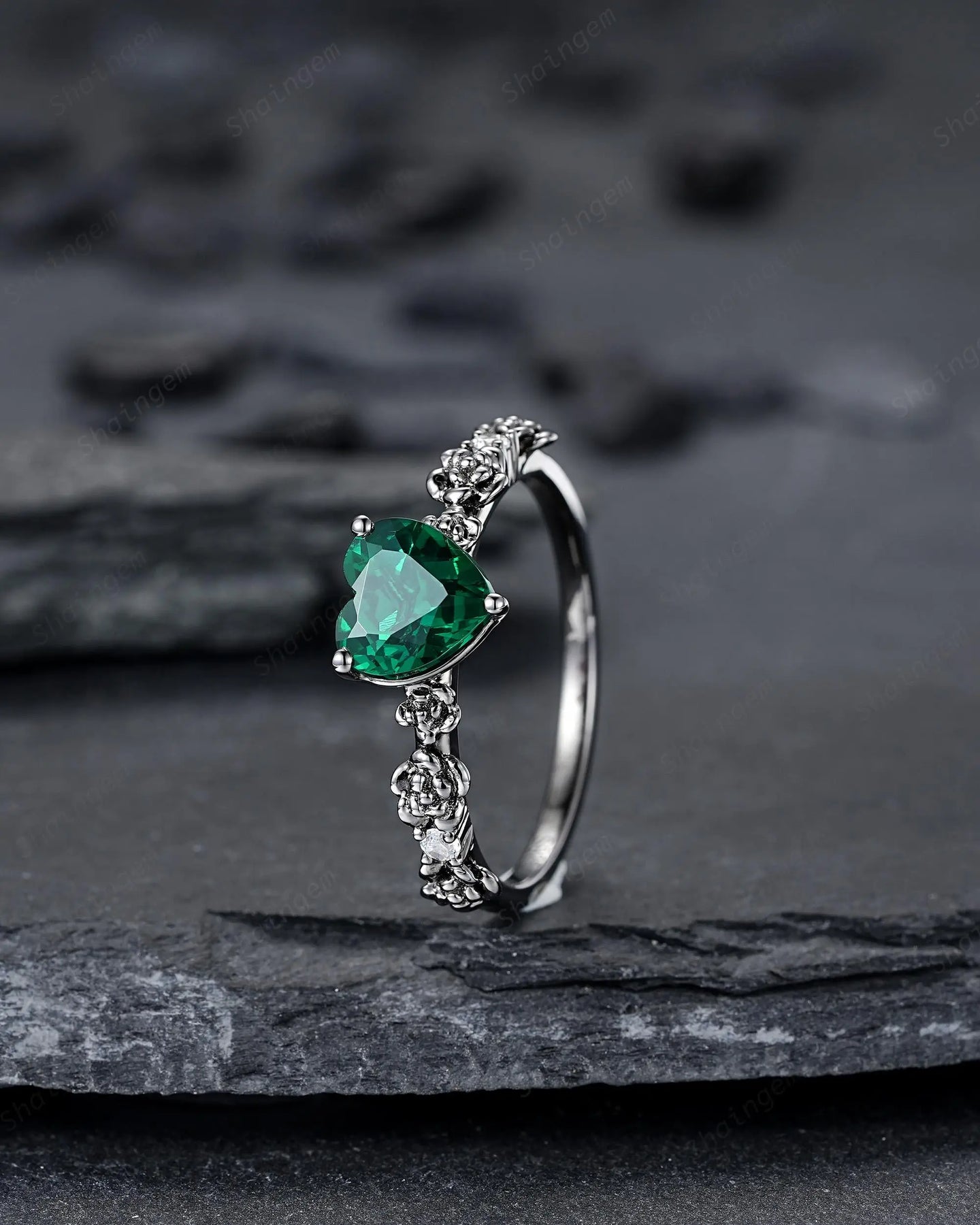 Gothic Black Gold Heart Shape Emerald Engagement Ring, Rhodium Black Love Promise Ring, Witchy Rose Flower Promise Anniversary Ring Gift - ShainJewelry