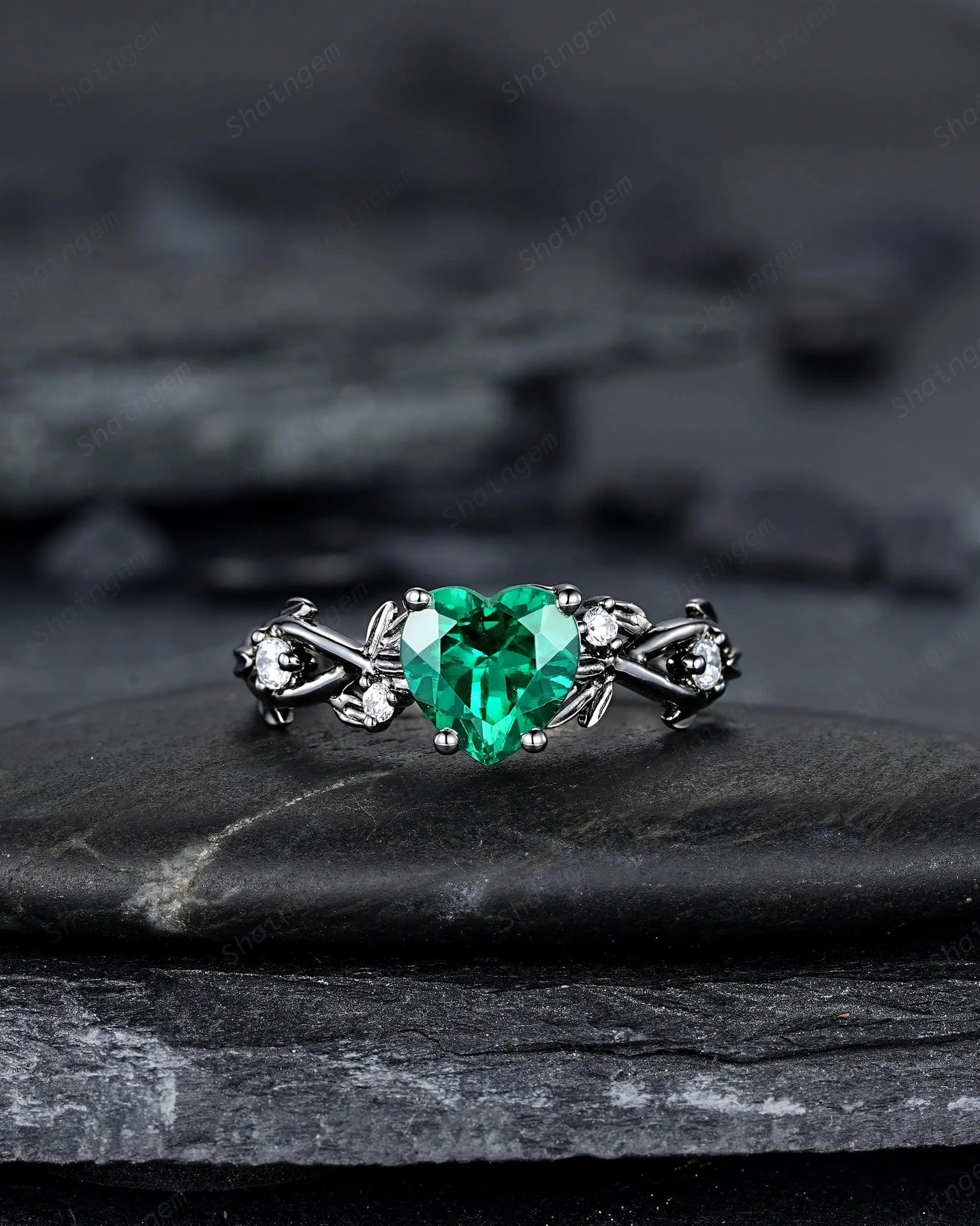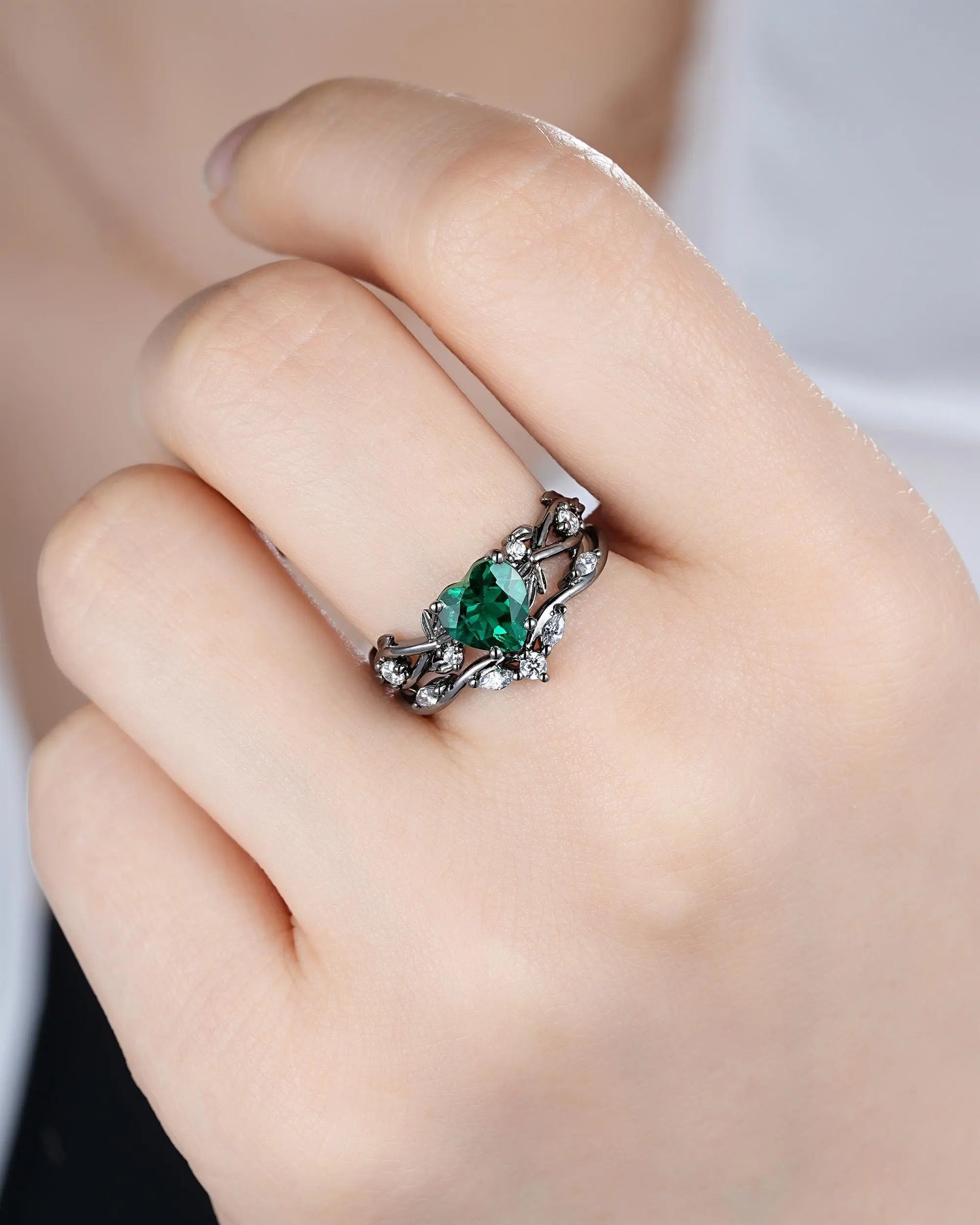 Gothic Heart Shape Emerald Engagement Ring Set: Dark Black Rhodium Promise Ring, Twig Leaf Wedding Ring, Unique Black Gold May Birthstone