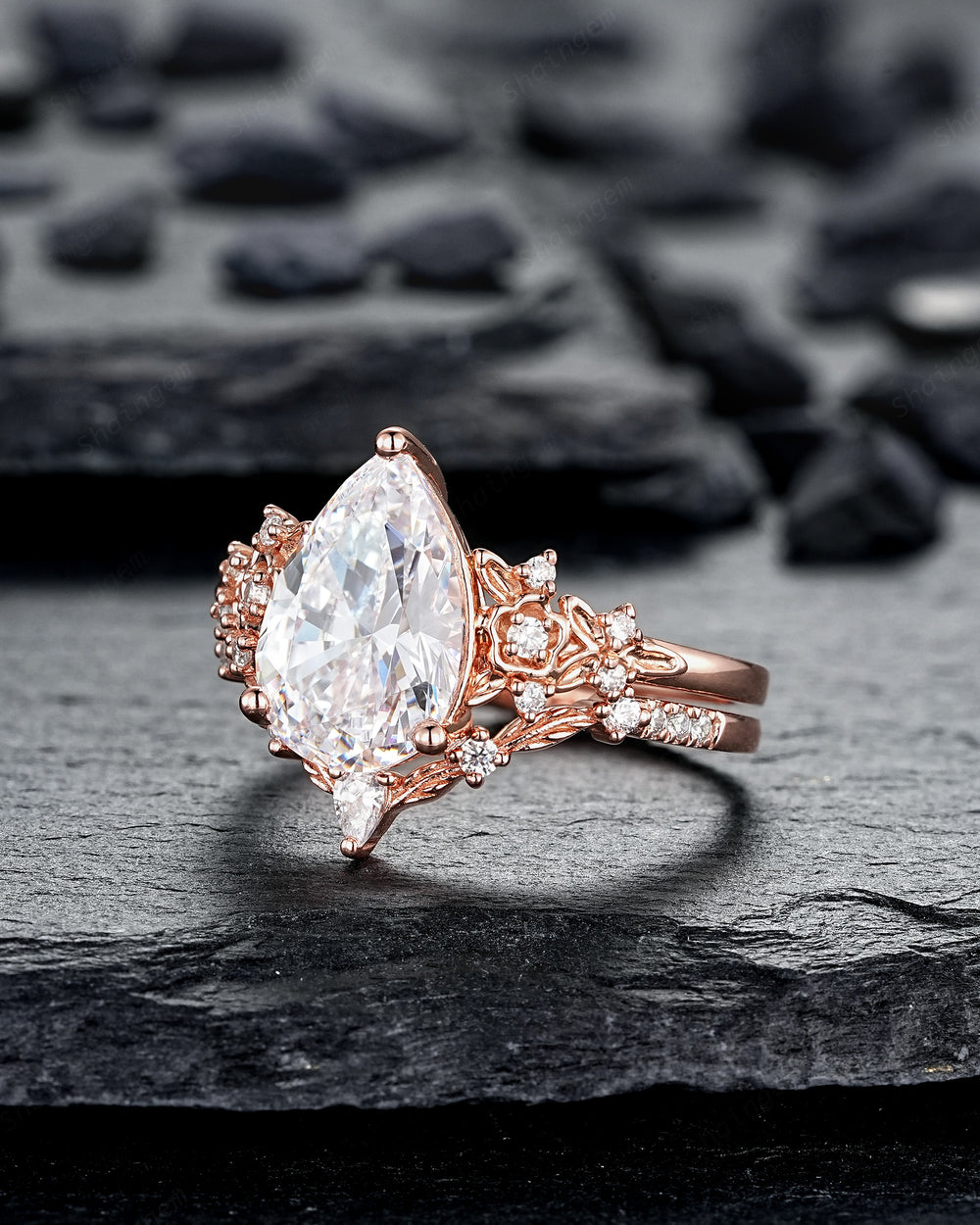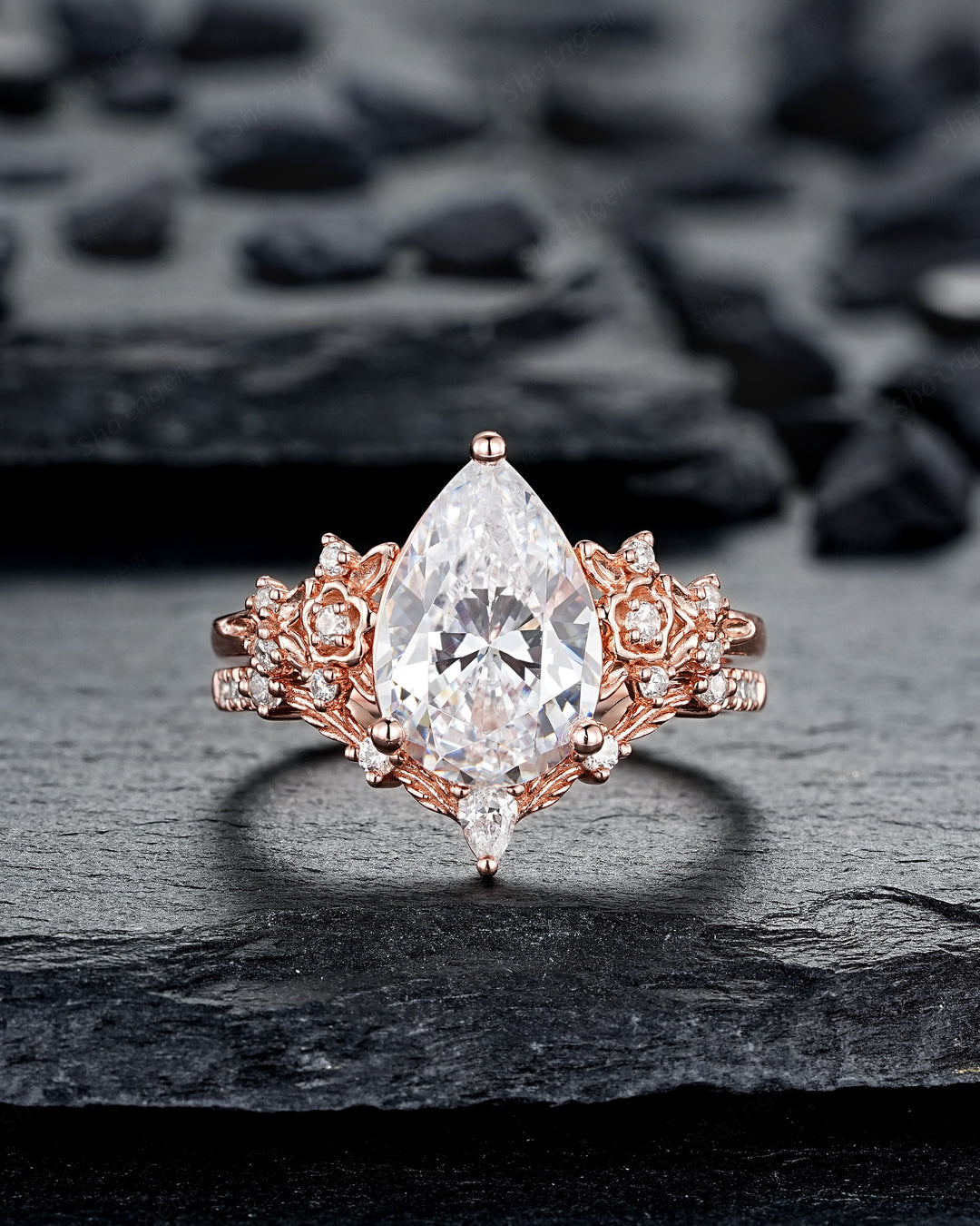 Vintage Pear Shape Moissanite Floral Engagement Ring Unique Rose Gold Twig Branch Vine Wedding Set Nature Inspired Promise Ring for Women her