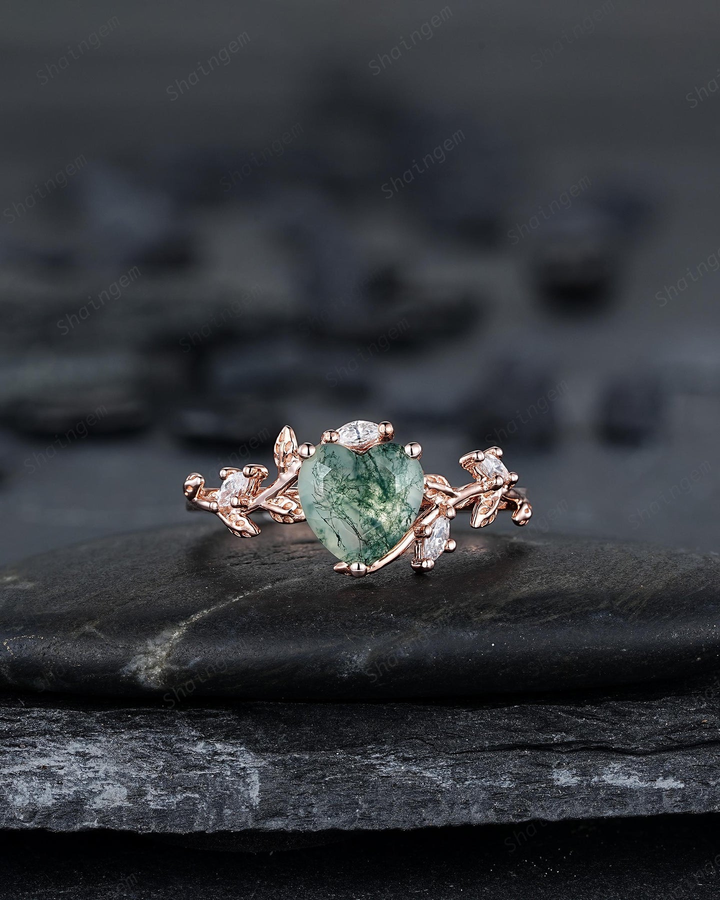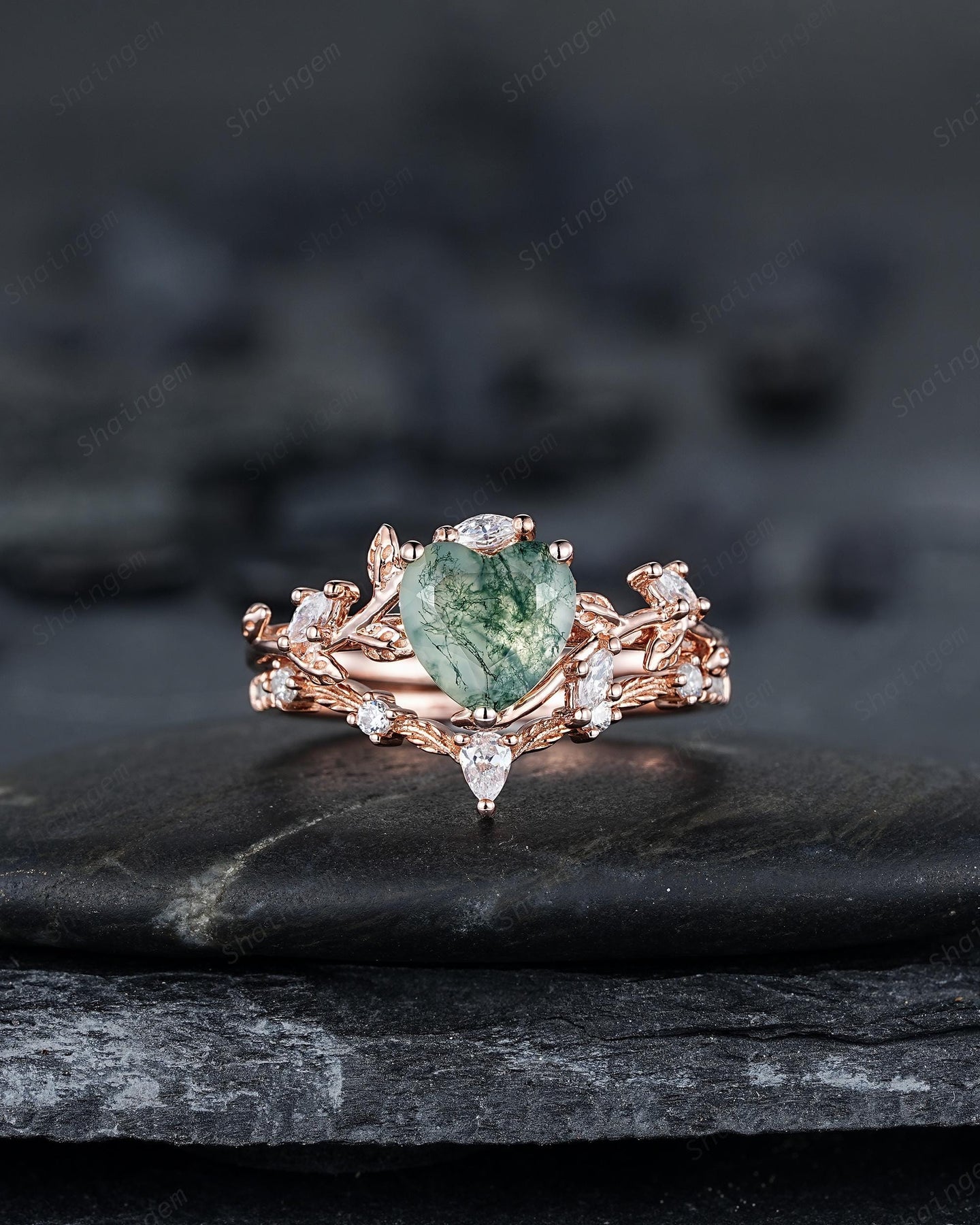 Heart Shape Moss Agate Engagement Ring: Rose Gold Twig Branch Vine Leaf Wedding Set, Nature Inspired Promise Ring, 24K Gold Plated, Platinum