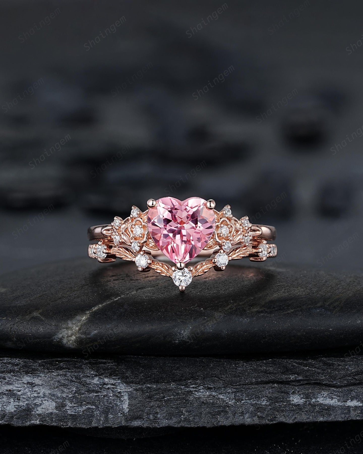 Vintage Heart Shape Padparadscha Pink Sapphire Floral Engagement Ring, Rose Gold Vine Leaf Wedding Set, Nature Inspired Flower Promise Ring - ShainJewelry