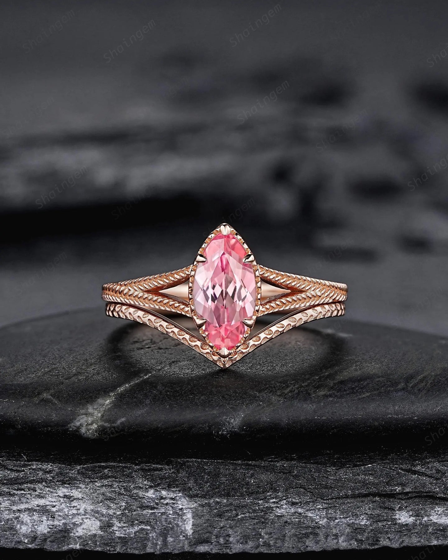 Vintage Spilt Shank Marquise Pink Sapphire Engagement Ring, Unique Curved Wedding Promise Ring, V Shape Milgrain Rose Gold Anniversary Ring