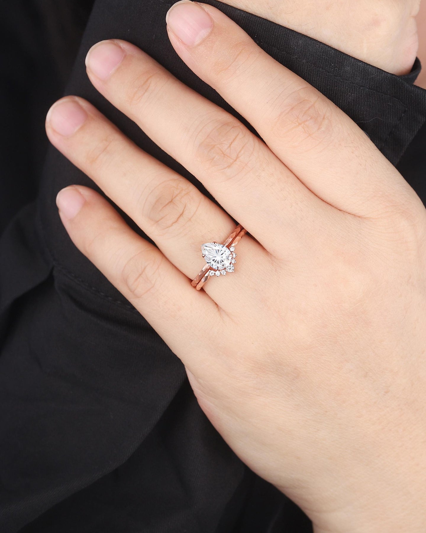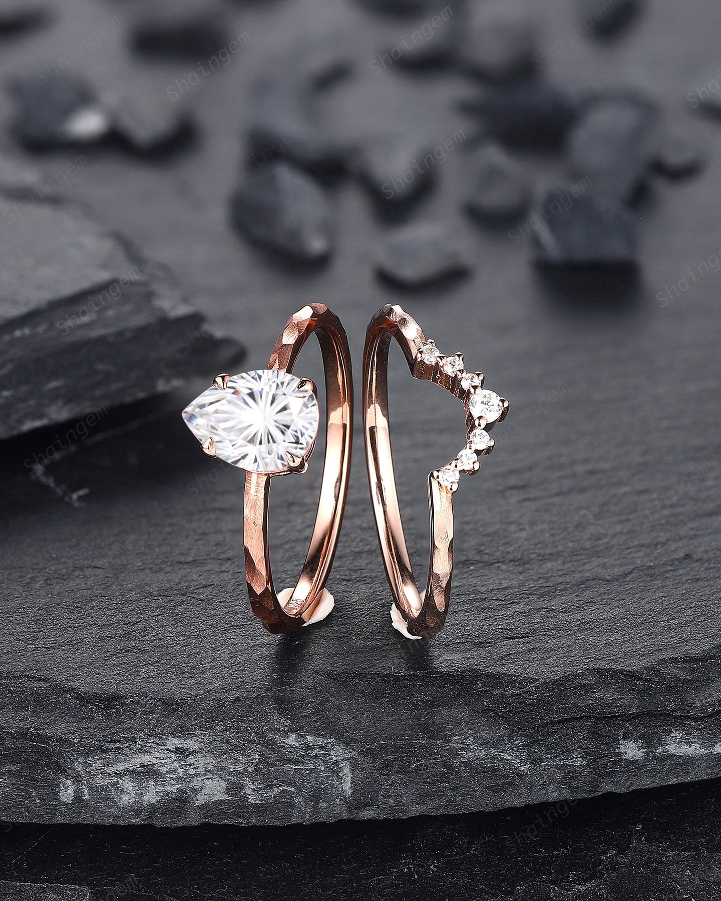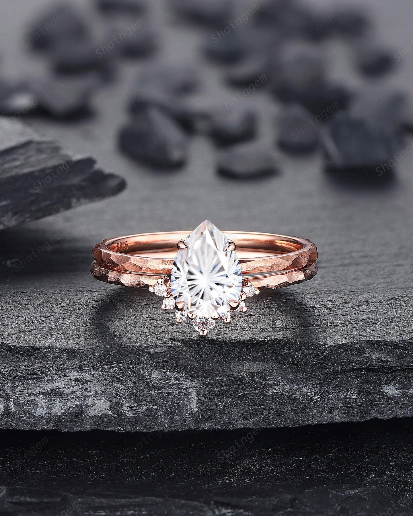 Unique Hammered Pear Shape Fireworks Cut Moissanite Engagement Ring Set, Hand Forged 14K 18K Rose Gold Diamond Bridal Set Promise Ring Gift