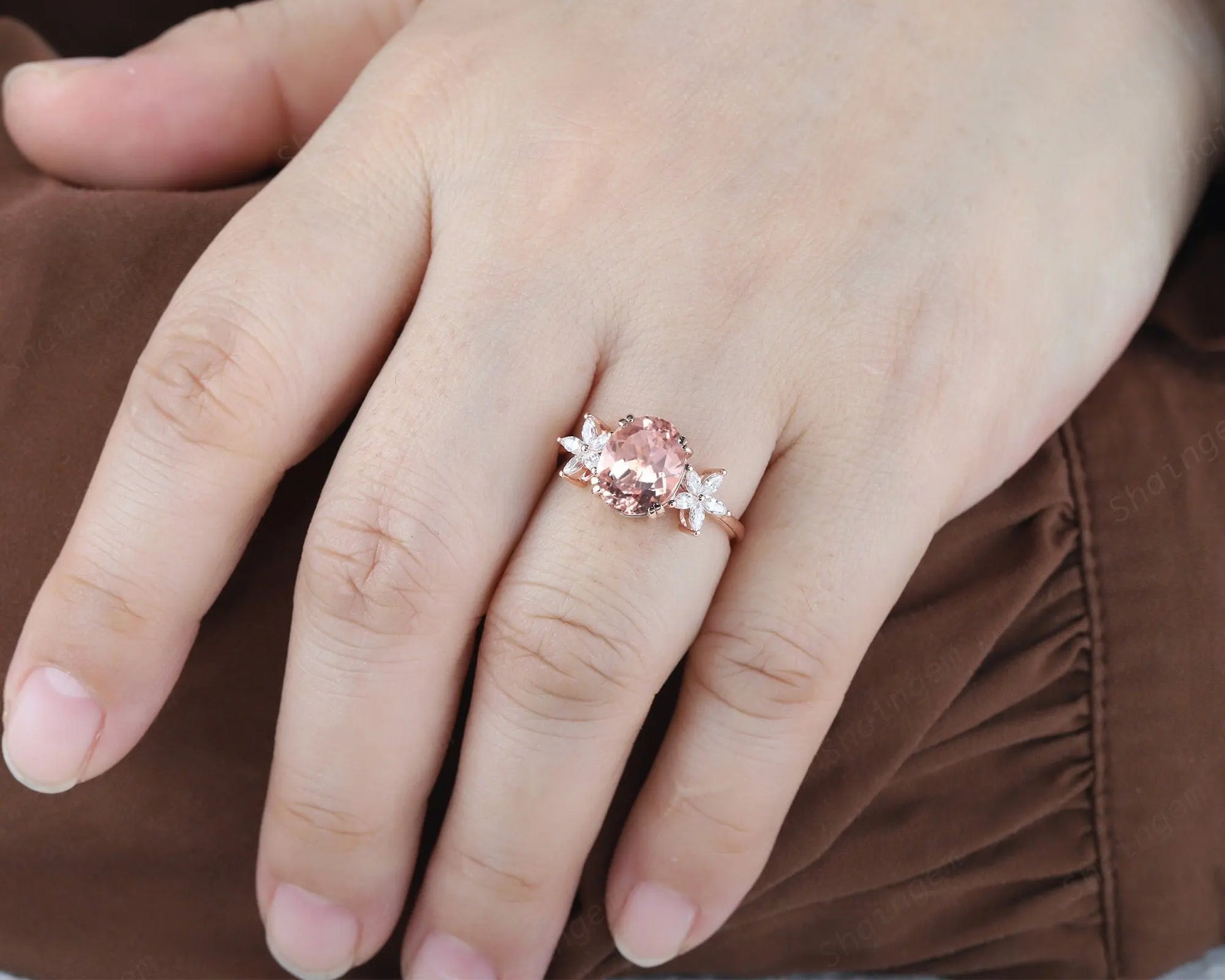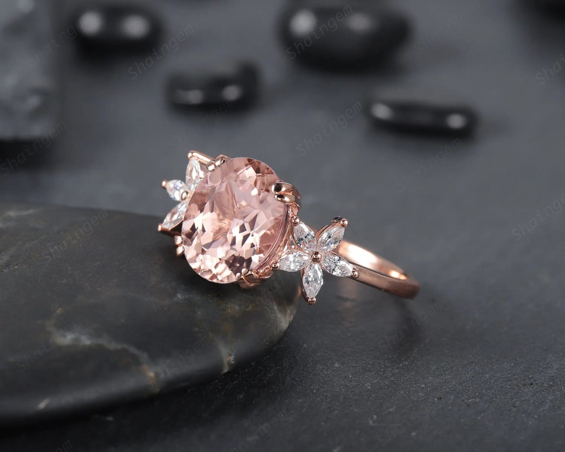 Vintage 8x10mm Oval Pink Morganite and Marquise Diamond Engagement Ring, Unique 14K Rose Gold Cluster Morganite Promise Ring, Wedding Ring