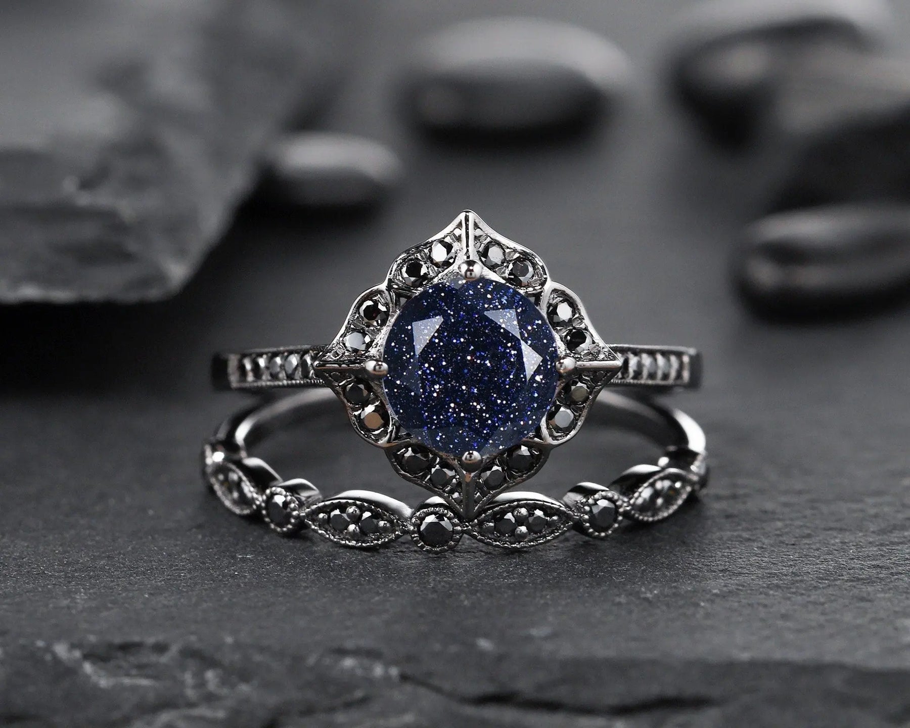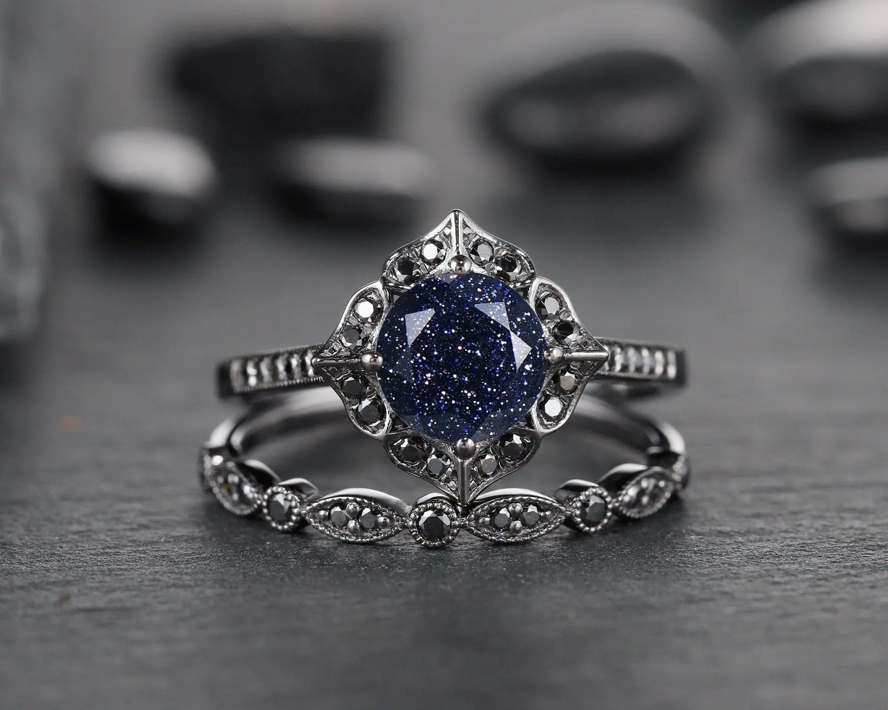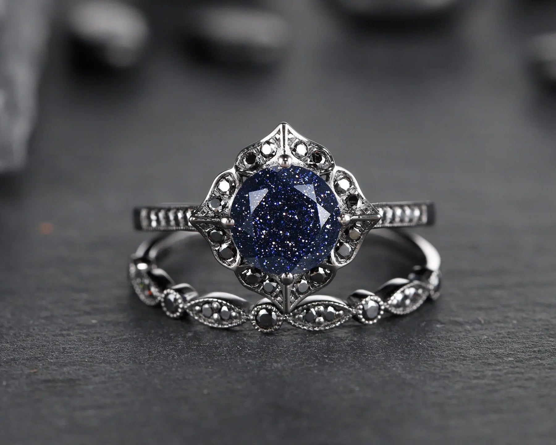 Shining starry blue sandstone bridal set with solid black gold setting, star galaxy stone is very rare to find from nature, to meet fans that're in love with such special starry fire stone, we sourced this special lab created blue sandstone, hope you could enjoy it and love it.