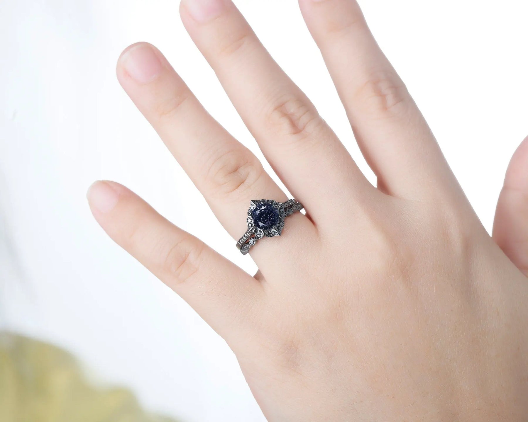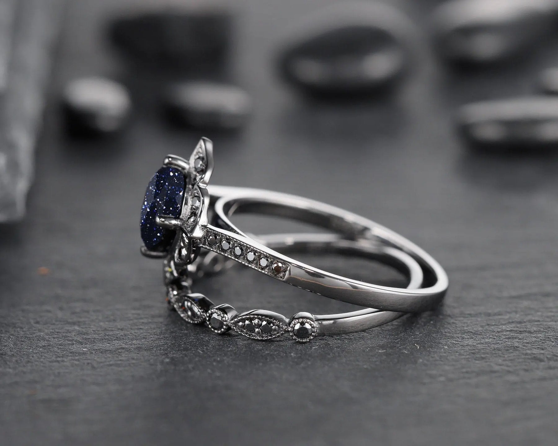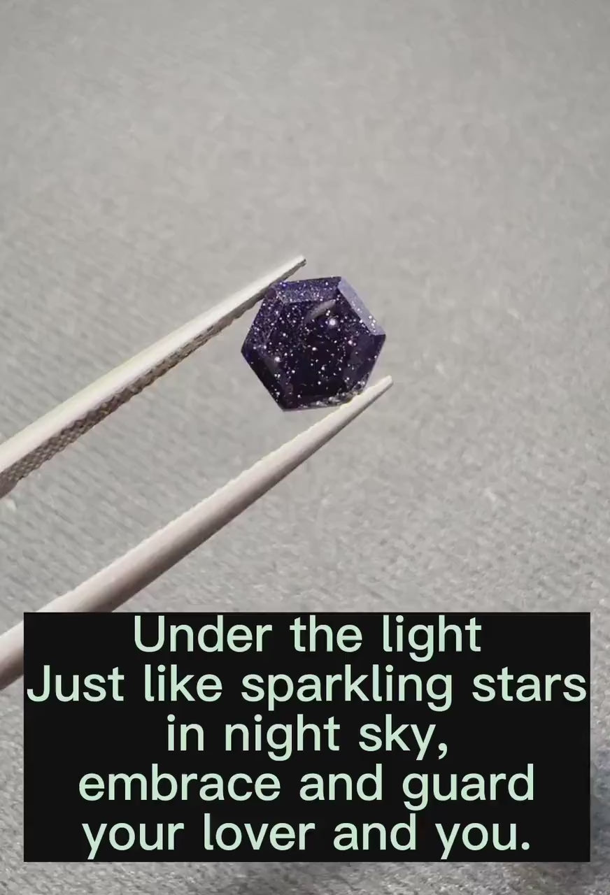 Shining starry blue sandstone bridal set with solid black gold setting, star galaxy stone is very rare to find from nature, to meet fans that're in love with such special starry fire stone, we sourced this special lab created blue sandstone, hope you could enjoy it and love it.