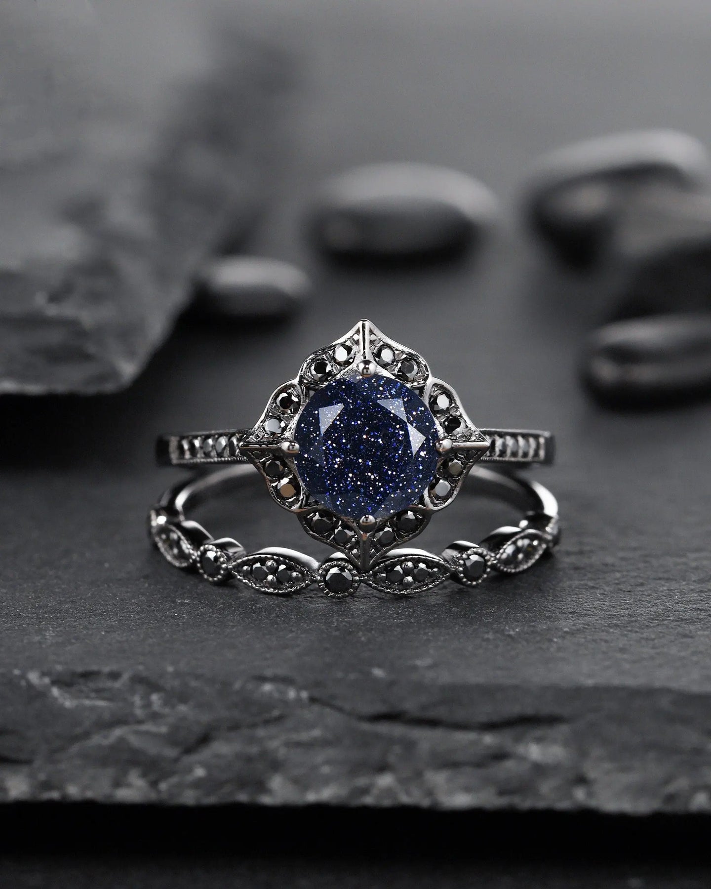 Vintage Blue Sandstone Floral Engagement Ring Set, Unique Black Gold Vermeil Blue Sandstone Promise Ring Set, Black Diamond Bridal Set Gift