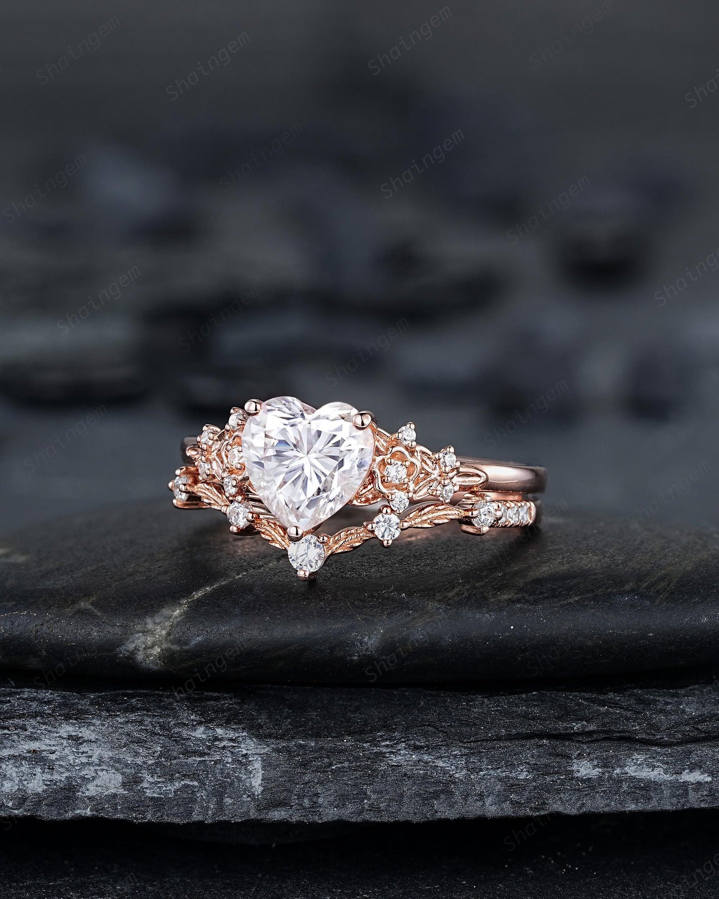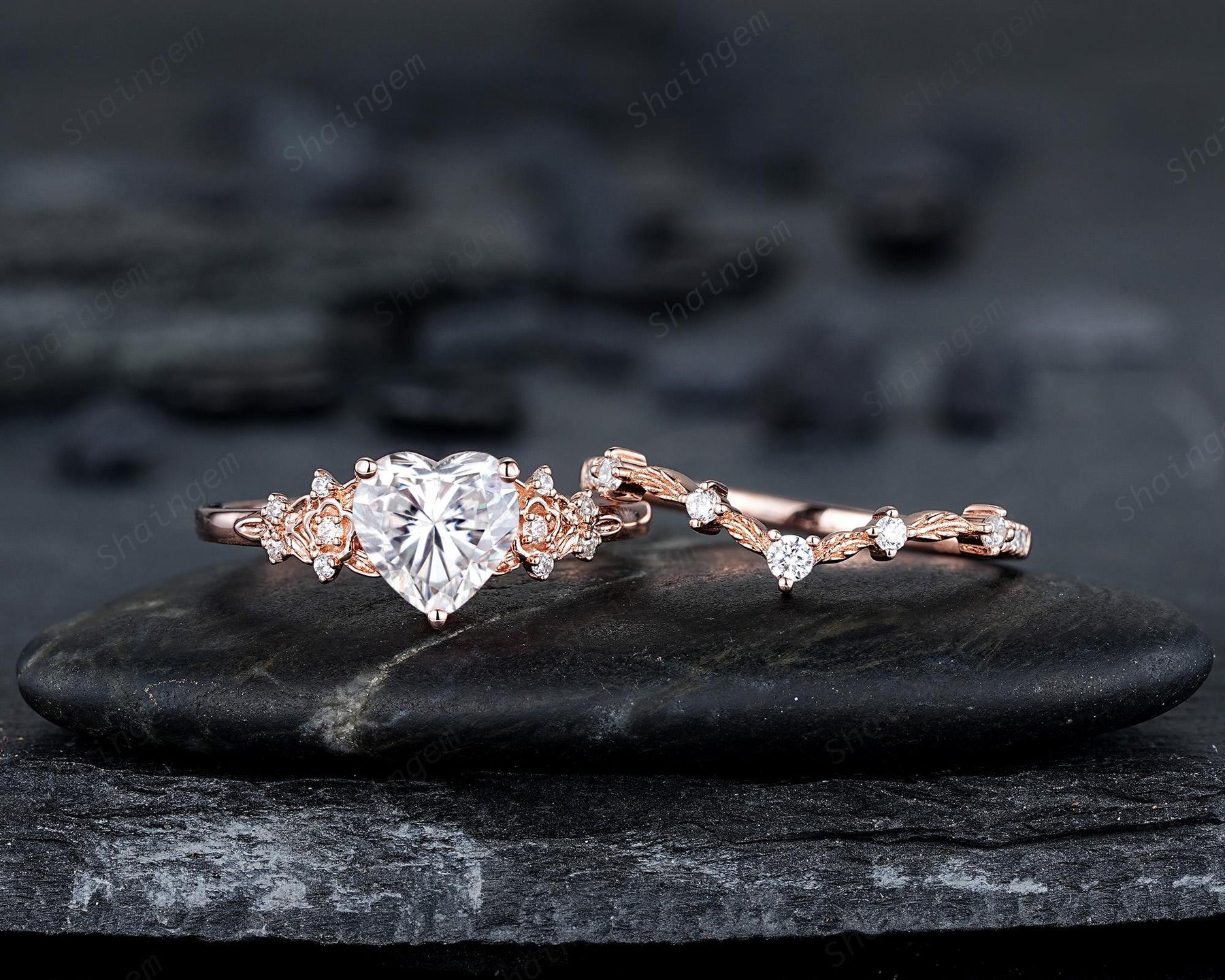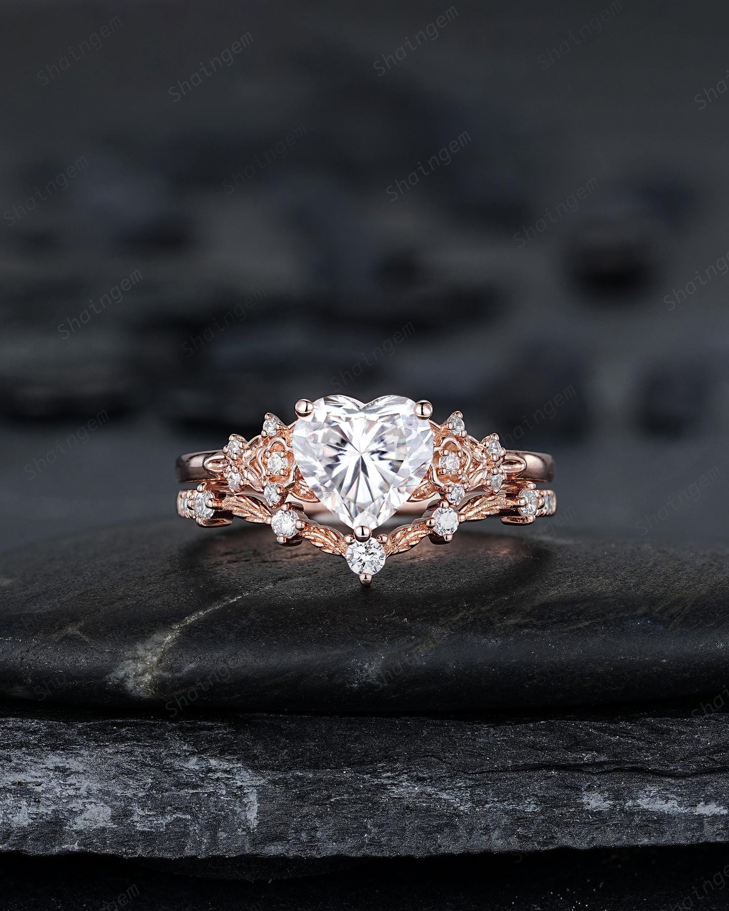 Vintage Heart Shape Moissanite Floral Engagement Ring, Rose Gold Leaf Wedding Set, Nature Inspired Flower Promise Ring, Twig Branch Rings