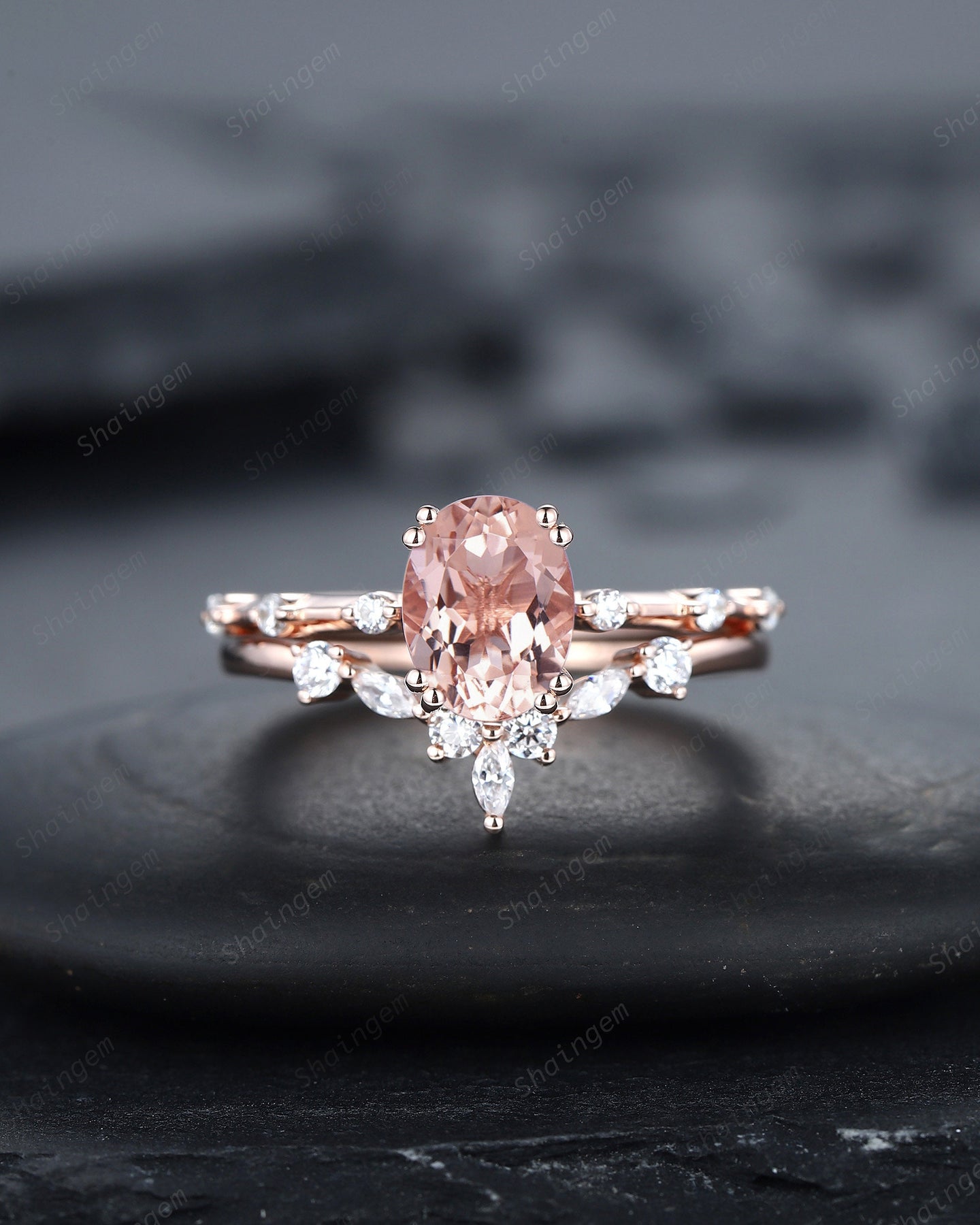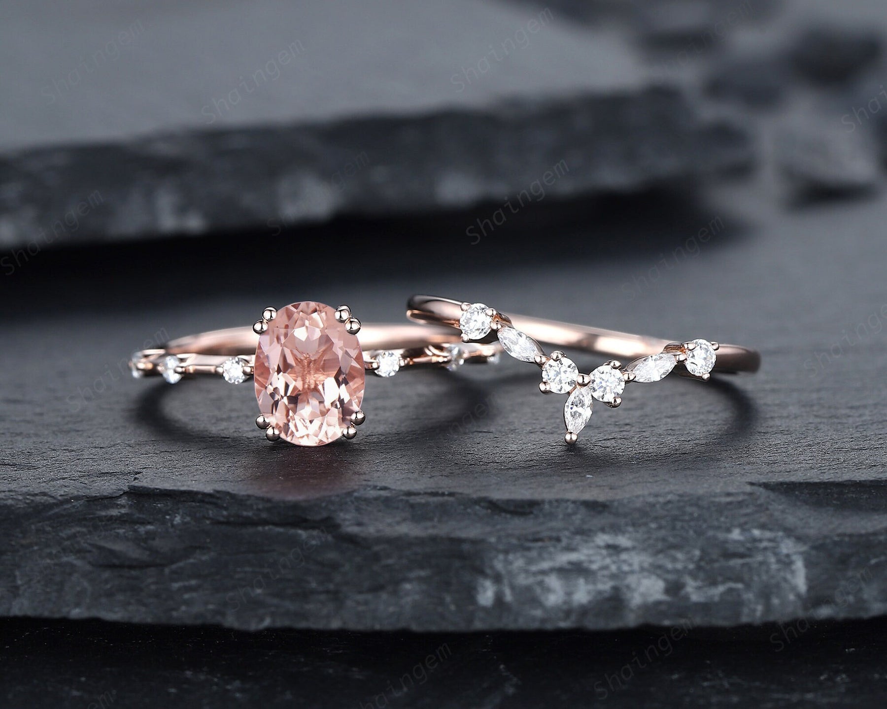 Vintage Oval Cut Pink Morganite Engagement Ring Set, Unique Pink Morganite Promise Ring, Morganite Hidden Halo Bridal Set Wedding Ring Gift