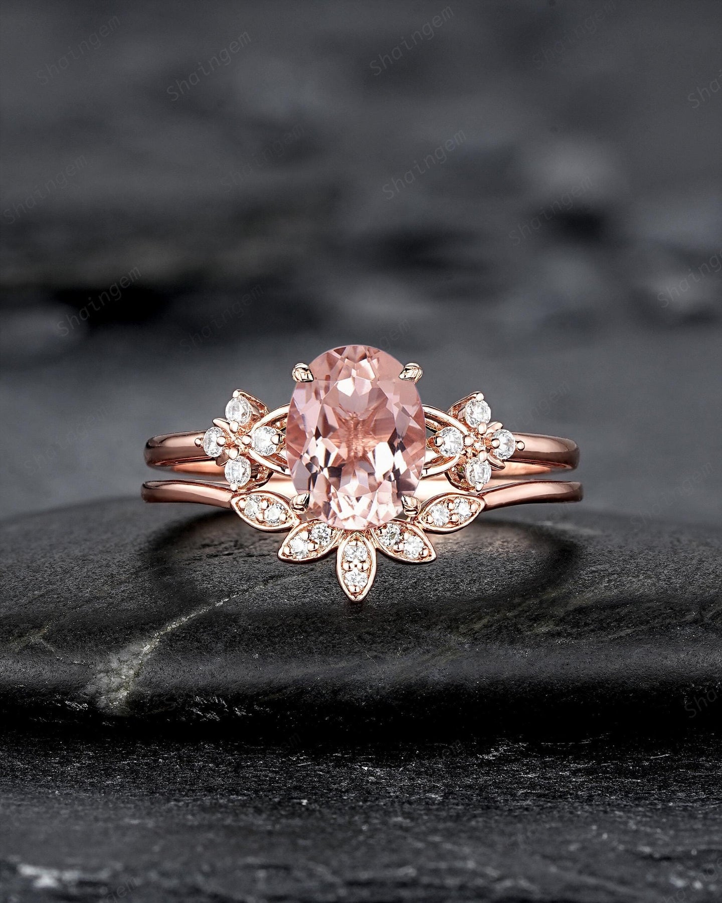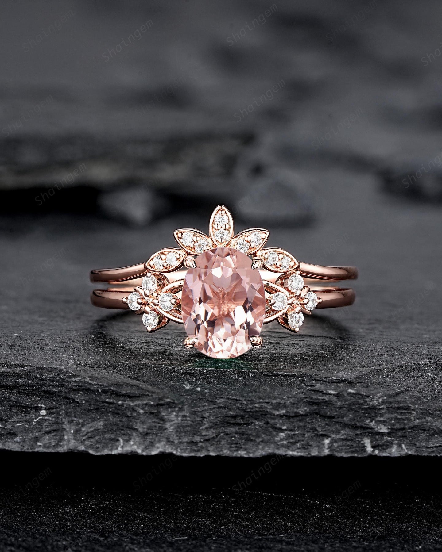 Vintage Oval Pink Morganite Floral Engagement Ring Set, Rose Gold Morganite Wedding Ring, Unique Cluster Bridal Set Promise Ring for Women