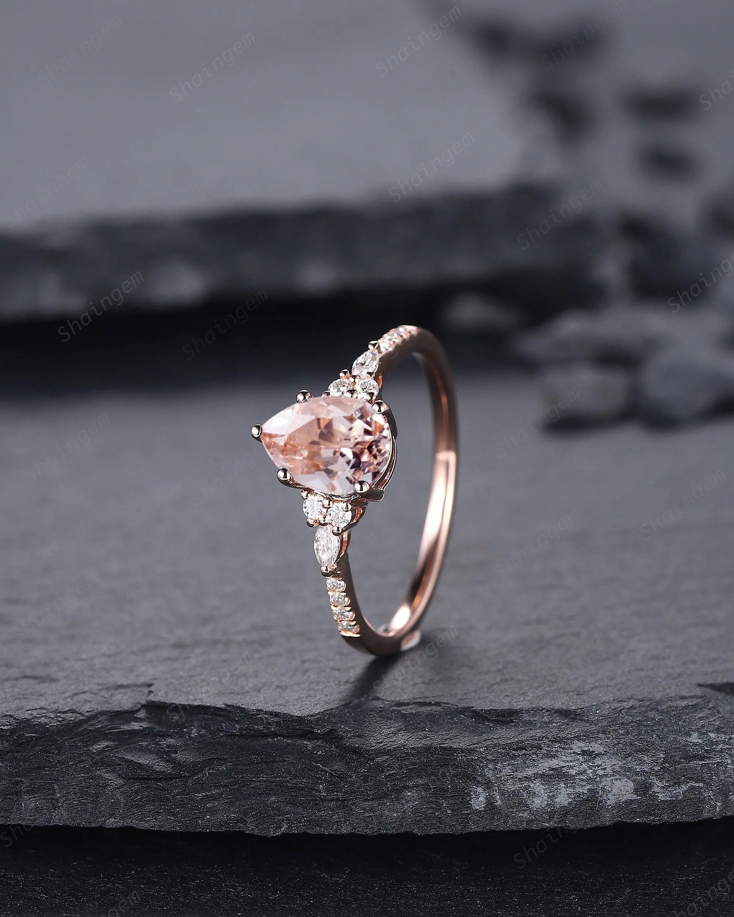 Vintage Pear Pink Morganite Engagement Ring, Unique 14K Rose Gold Teardrop Morganite Wedding Ring, Art Deco Morganite Promise Ring Gift