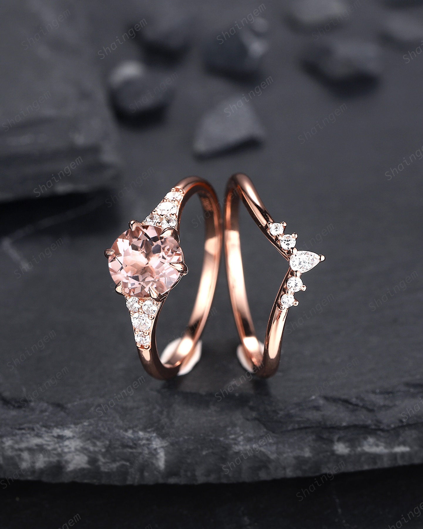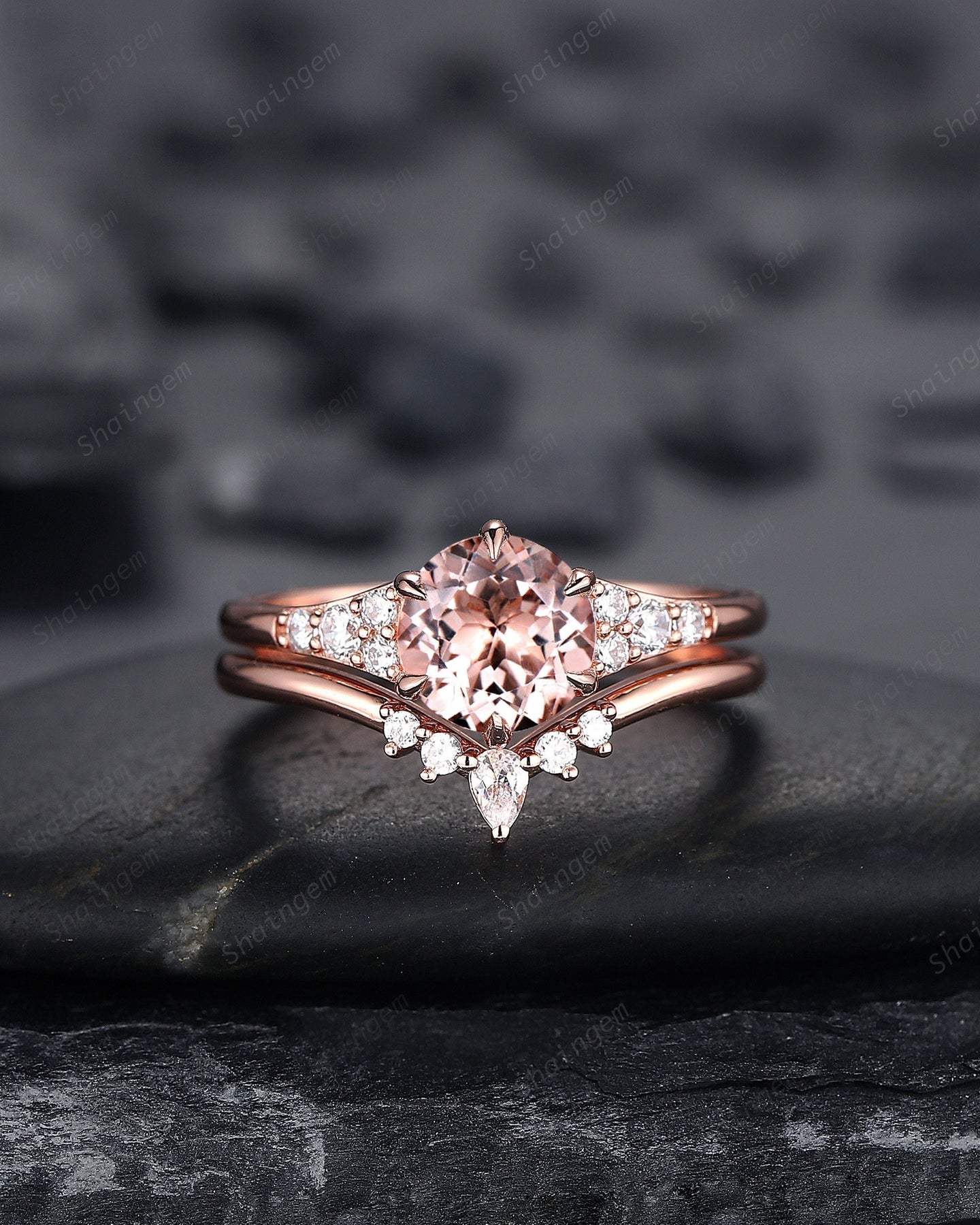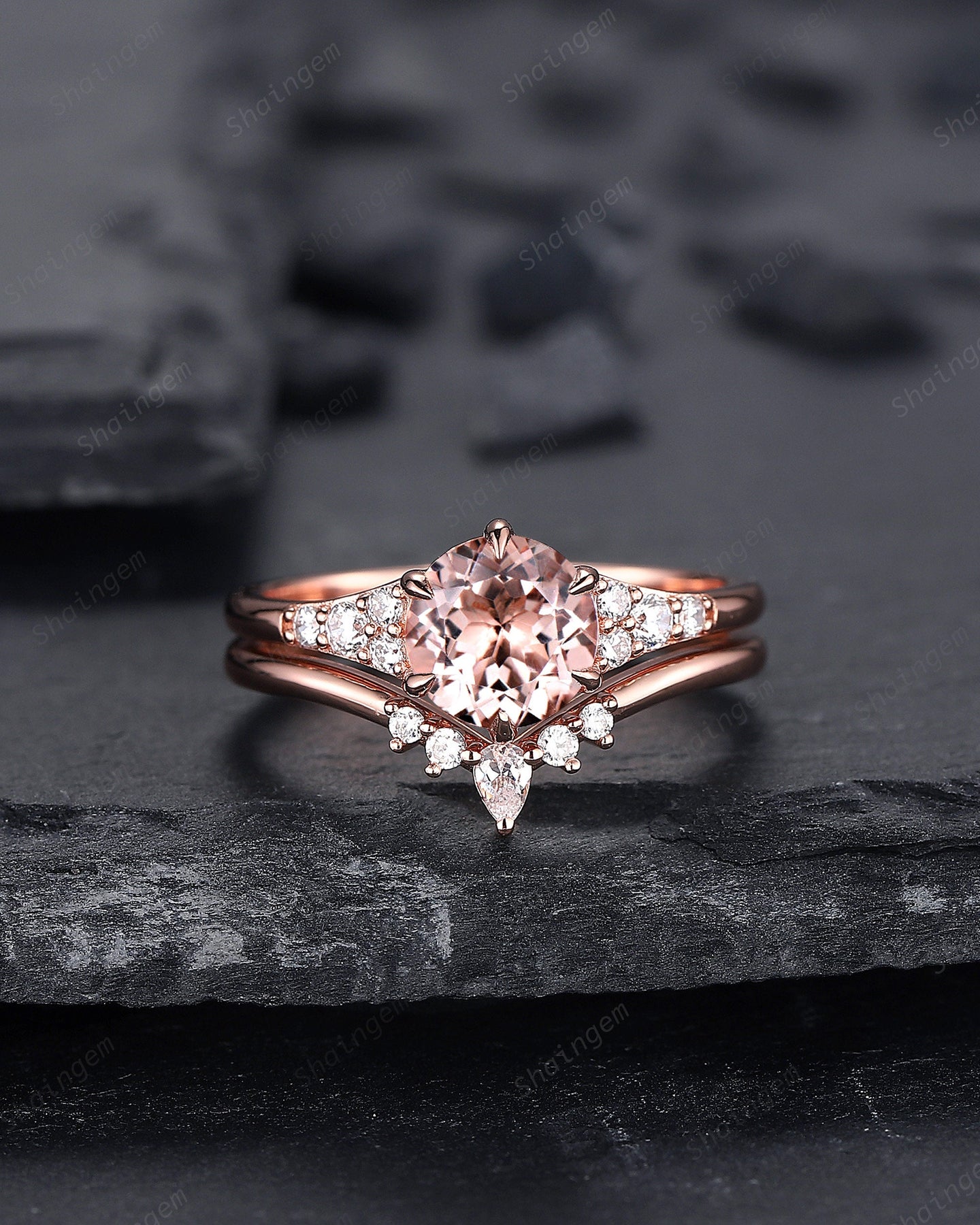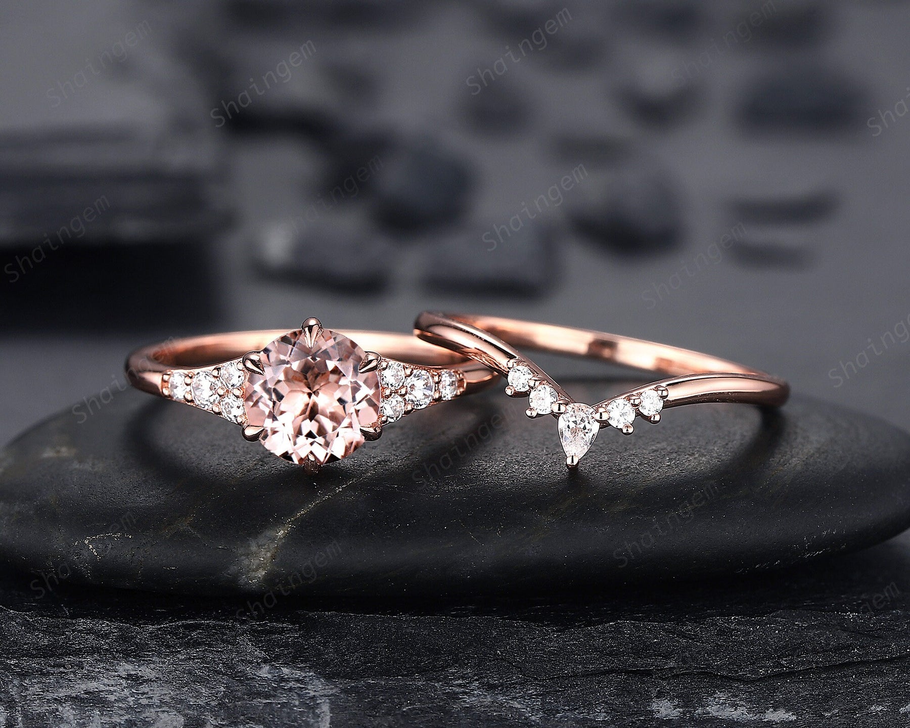 Vintage Round Shape Pink Morganite Engagement Ring Set, Unique 14K Rose Gold Morganite Bridal Set, Art Deco Promise Wedding Anniversary Ring